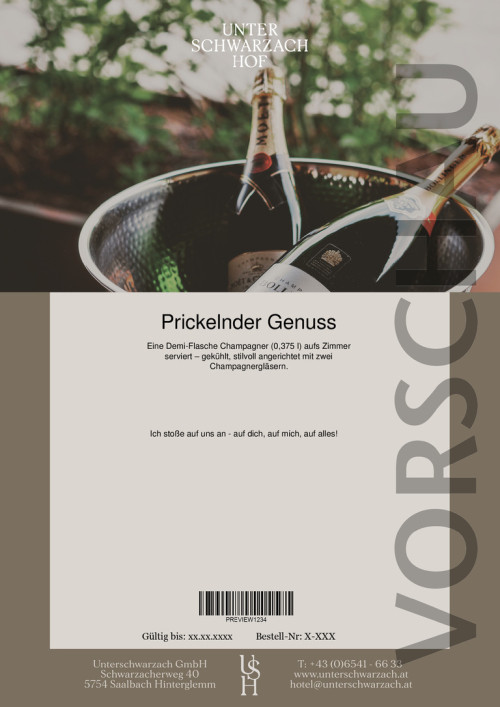 Eine Demi-Flasche Champagner (0,375 l) aufs Zimmer serviert – gekühlt, stilvoll angerichtet mit zwei Champagnergläsern.